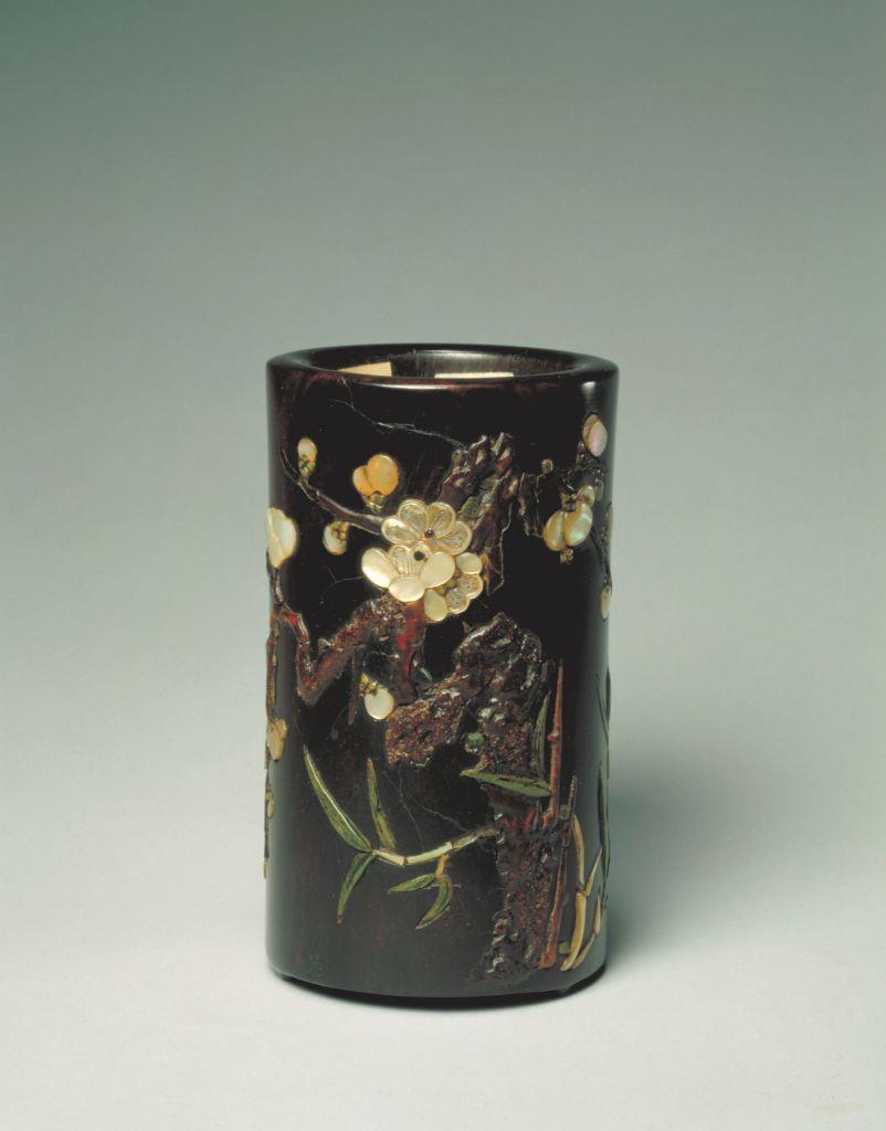 清代紫檀嵌螺钿梅竹图笔筒(故宫博物院藏)