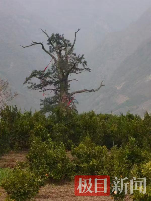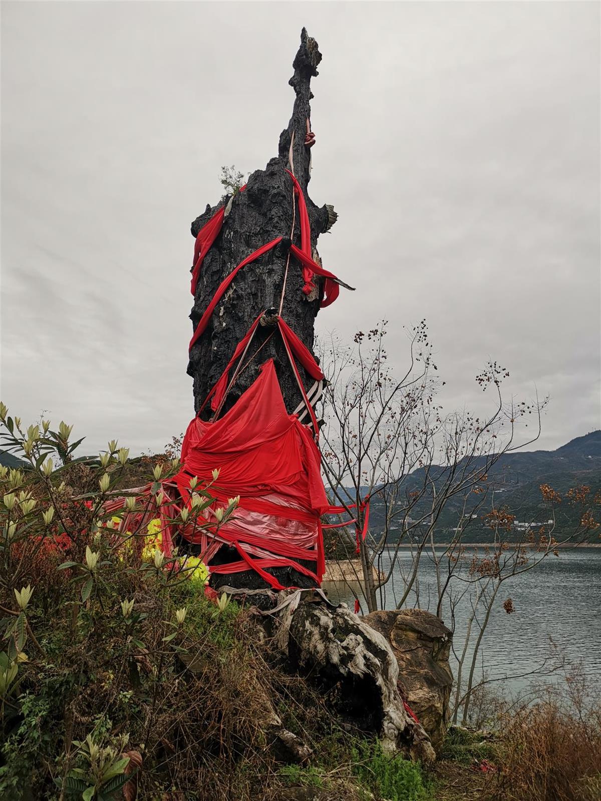 一截焦黑的树干上,红布缠得周正,江风掠过,那抹艳色便在苍黄的滩涂上晃荡,像一团不肯熄灭的火。在秭归县沙镇溪镇范家坪村的长江岸边,这棵只剩独杆的油杉,就以这样倔强的姿态立着,千年风霜,一村悲欢,全嵌在这皲裂的年轮里了。