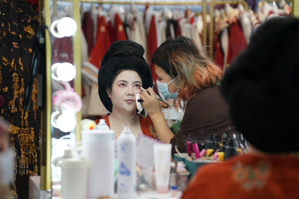 1月9日,李欢在进行唐果子制作体验项目前化唐妆。新华社记者 邵瑞 摄