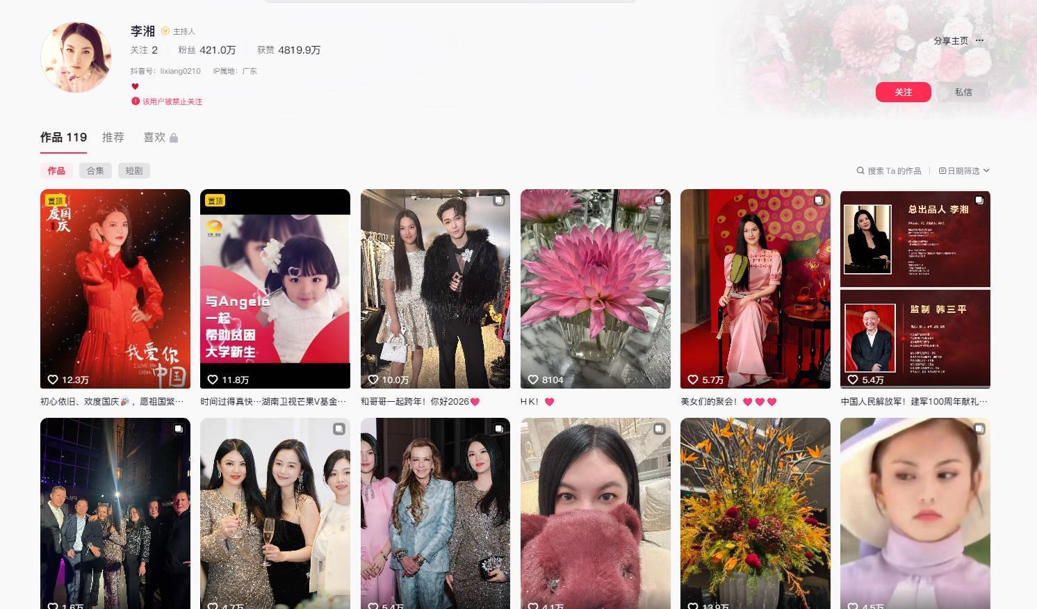 1月16日,新闻记者注意到,前湖南卫视主持人李湘的抖音、小红书和微博的账号被禁止关注。