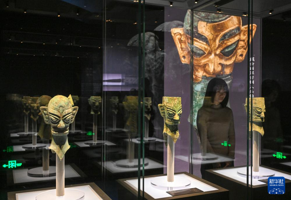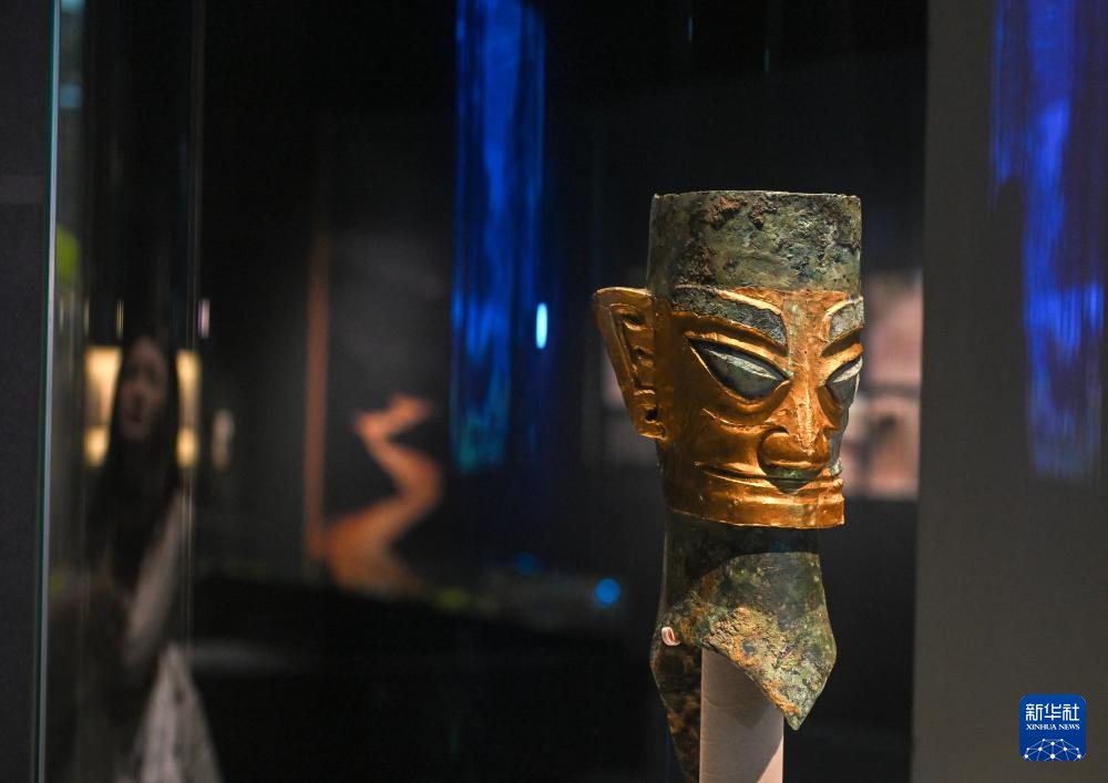这是展出的戴金面罩青铜人头像(1月18日摄)。