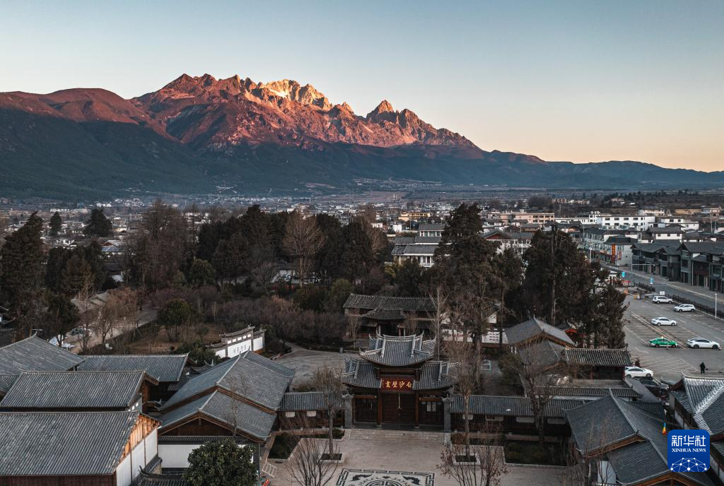 1月16日在云南省丽江市白沙镇拍摄的玉龙雪山和白沙壁画博物馆(无人机照片)。