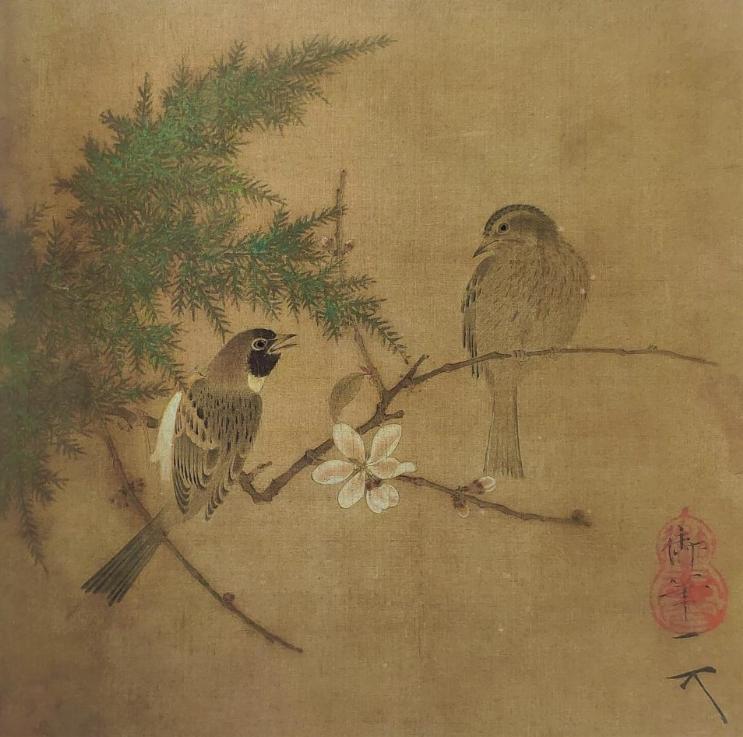 在宋徽宗赵佶的《蜡梅双禽图》中,我们得以窥见宋代宫廷审美的极致精微:梅与柏枝交错,一对山雀栖于梅梢,相视而鸣,眼珠以生漆点睛,栩然如生,白梅点缀其间,春意暗藏。