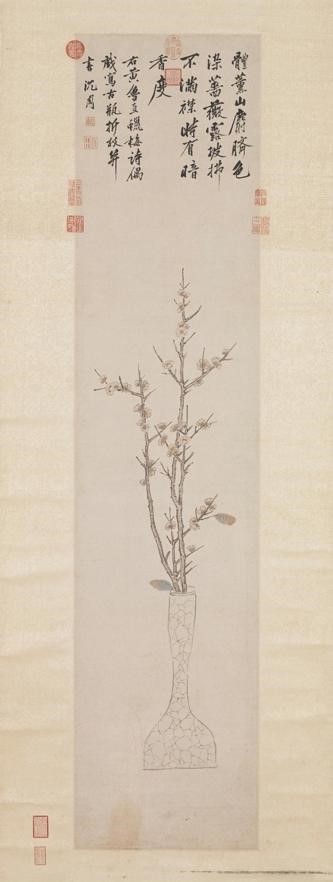 而数百年后,明代沈周在《瓶中蜡梅轴》中,则呈现出另一种美学追求。其笔下的瓶梅逸格,以书入画,枝如屈铁,全凭水墨氤氲与笔法节奏传达梅之清韵。画幅上方,沈周以行书记录了黄庭坚的咏蜡梅诗:“体薰山麝脐,色染蔷薇露。披拂不满襟,时有暗香度。”诗画呼应,香气似已破纸而出,并自题“偶戏写古瓶折枝”,尽显文人游戏笔墨、直抒心性的洒脱。