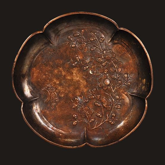 银盘作五曲梅花形,口径盈掌,器壁匀薄。其精髓全在盘心:工匠以锤揲浮雕之法,錾刻出一幅微缩的月夜小景——水波浅浅为地,梅枝横斜如画,枝头梅花或含苞,或初绽,意态天然;一弯新月掩映于流云之后,清辉仿佛正洒向疏朗的梅影。此般图式,被后世雅称为“梅梢月”,其意境直溯北宋隐逸诗人林逋“疏影横斜水清浅,暗香浮动月黄昏”的千古咏梅绝唱。