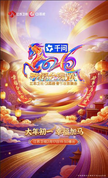 伴随晚会官宣,概念海报同步亮相。海报以四色骏马勾勒出的2026艺术造型为视觉核心,金紫交织的流光背景里,烟花次第绽放、灯笼错落摇曳,将“幸福合家欢”的晚会主题与“好事(horse)马上发生”的美好期许糅合得恰到好处。LOGO处的骏马由赤、金、黛、紫四色融合勾勒而成,精准诠释着晚会的多元内核——“赤”象征阖家团圆的喜庆底色与生活的蓬勃生机;“金”缀满云锦织金与苏绣金线的光泽,承载江苏千年文脉与富庶安康;“黛”以沉稳色调呼应“千问APP”品牌色,代表未来的智能与无限可能;“紫”则萦绕祥瑞气息,既蕴含“紫气东来”的美好愿景,也象征江苏多元文化的深度融合。