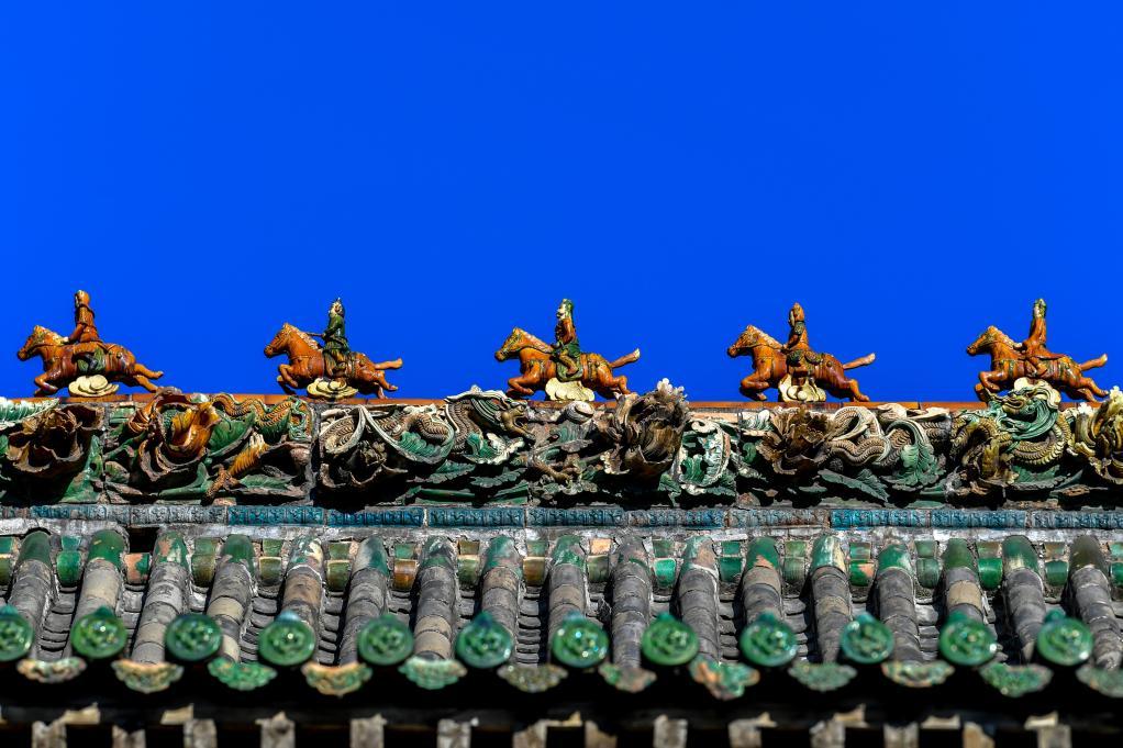 这是在山西省运城市关帝庙拍摄的古建顶上的飞马造型装饰构件。