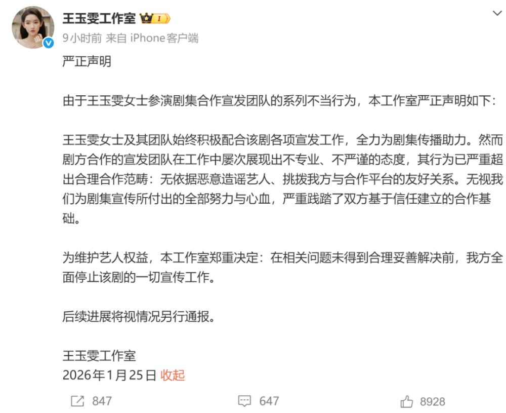 今日凌晨,王玉雯工作室就《突然的喜欢》剧组合作宣发团队的系列不当行为发布声明,表示将在相关问题未得到合理妥善解决前,全面停止该剧的一切宣传工作。