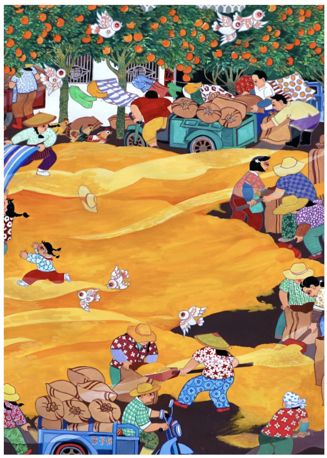 湖北农民画作为楚文化孕育的民间艺术瑰宝,融合刺绣、剪纸等民间艺术精华,以造型奇异浪漫、色彩明丽鲜活的风格著称,生动描绘田间耕耘、节庆欢聚等乡土图景,寄托着群众对美好生活的向往。