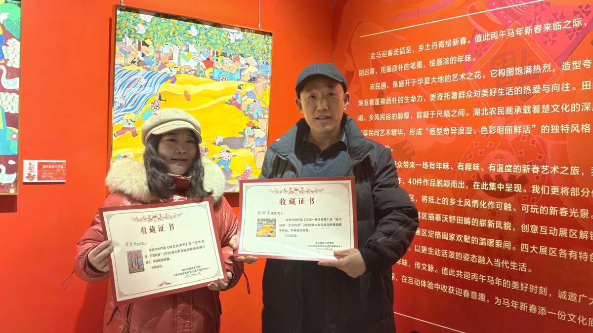 “我们的画笔,蘸着马口陶的古朴底蕴,映着汈汊湖的灵秀风光。我们以农耕丰收为景、以乡村新貌为题,用浓烈的色彩勾勒生活的喜悦,用质朴的线条描绘丰收的甜蜜……”1月26日,“乡土绘春・艺润荆楚”2026湖北农民画迎新春画展在湖北省群艺馆展示厅启幕,来自汉川的退休教师陈继东作为代表上台发言时如此感慨。
