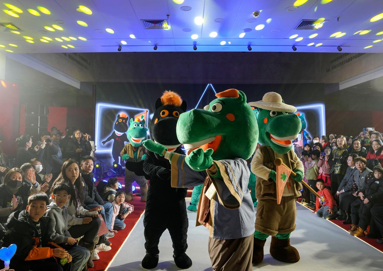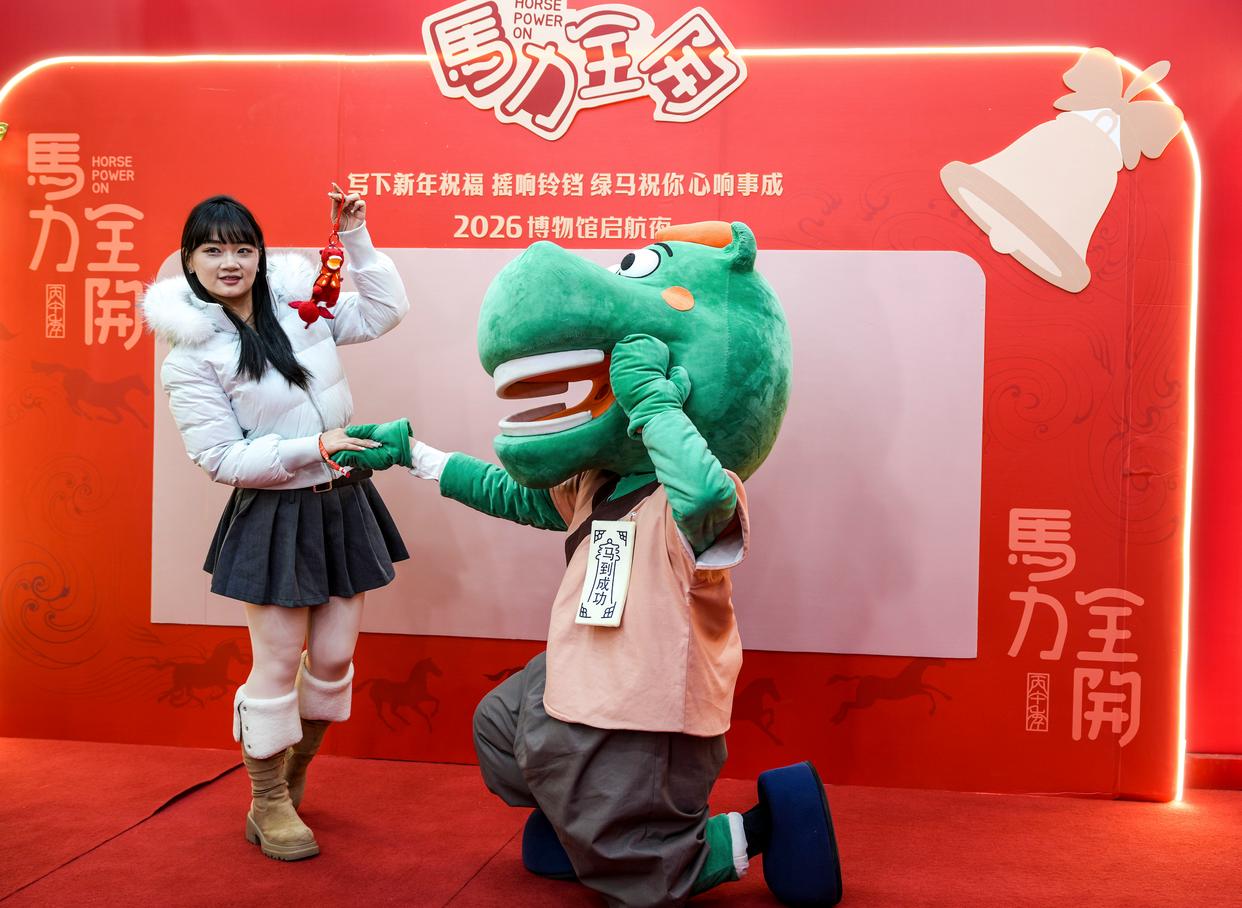 1月26日晚,在甘肃省博物馆一楼大厅,马踏飞燕IP人偶在“马力全开——博物馆启航夜”活动现场与观众互动。新华社记者 郎兵兵 摄