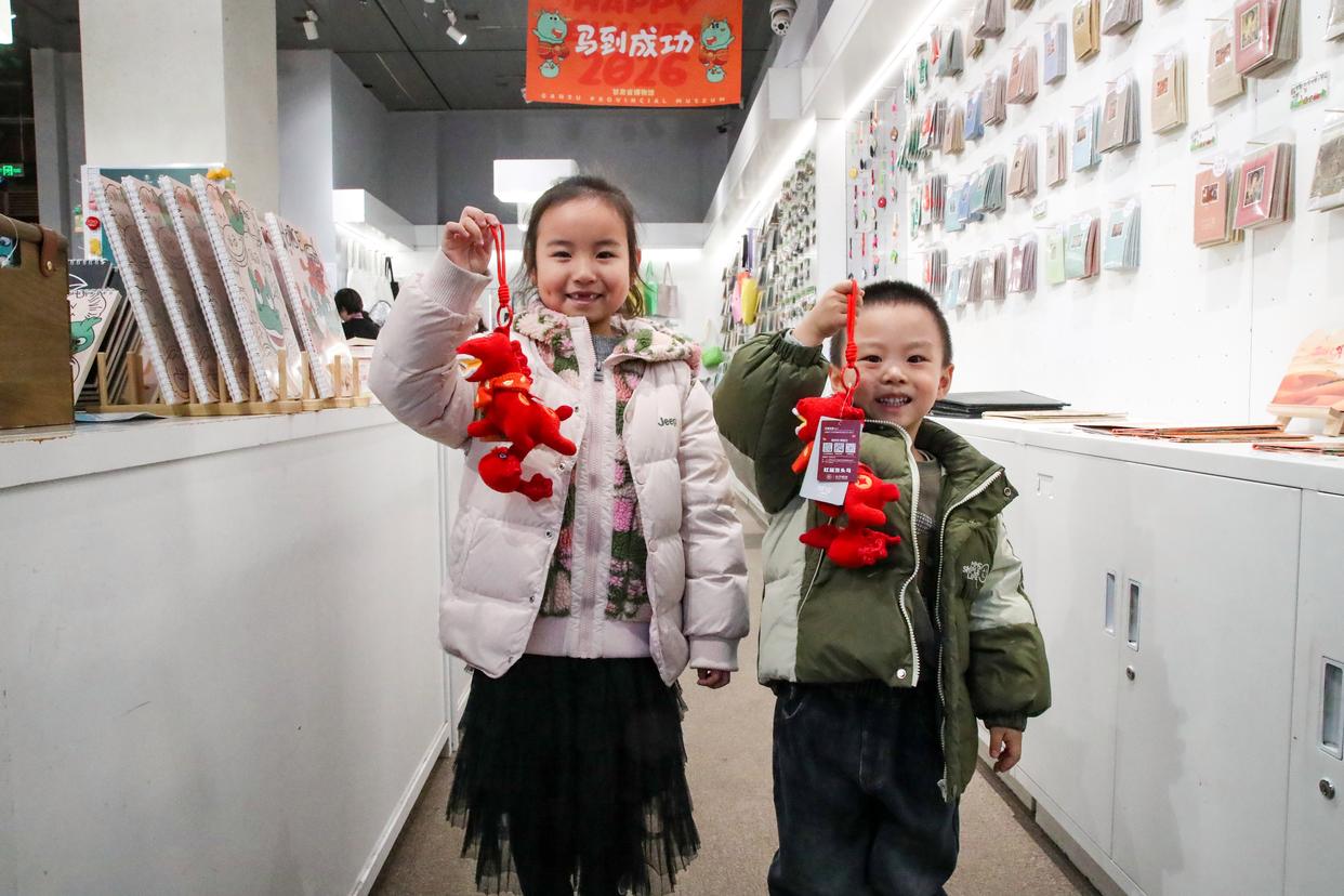 1月26日晚,在甘肃省博物馆文创商店,小朋友展示刚购买的新款马踏飞燕贺岁毛绒玩偶“红运当头马”。新华社记者 郎兵兵 摄
