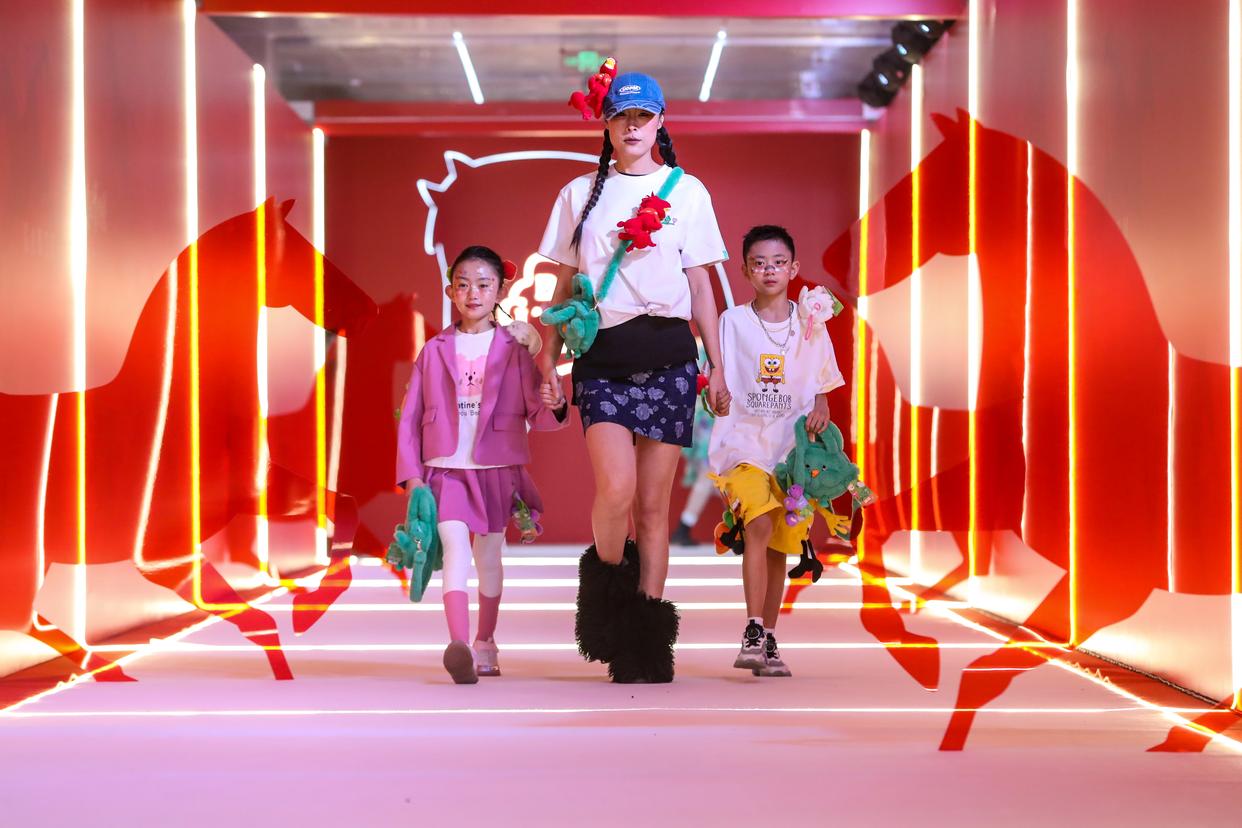 1月26日晚,在甘肃省博物馆一楼大厅,模特(中)佩戴新款马踏飞燕贺岁毛绒玩偶“红运当头马”走秀。新华社记者 郎兵兵 摄