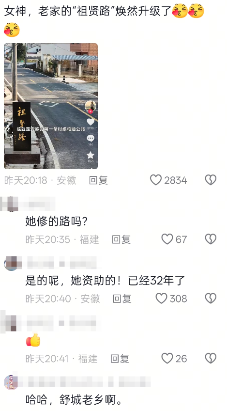 还有安徽网友在评论区晒出“祖贤路”照片,向她致谢。