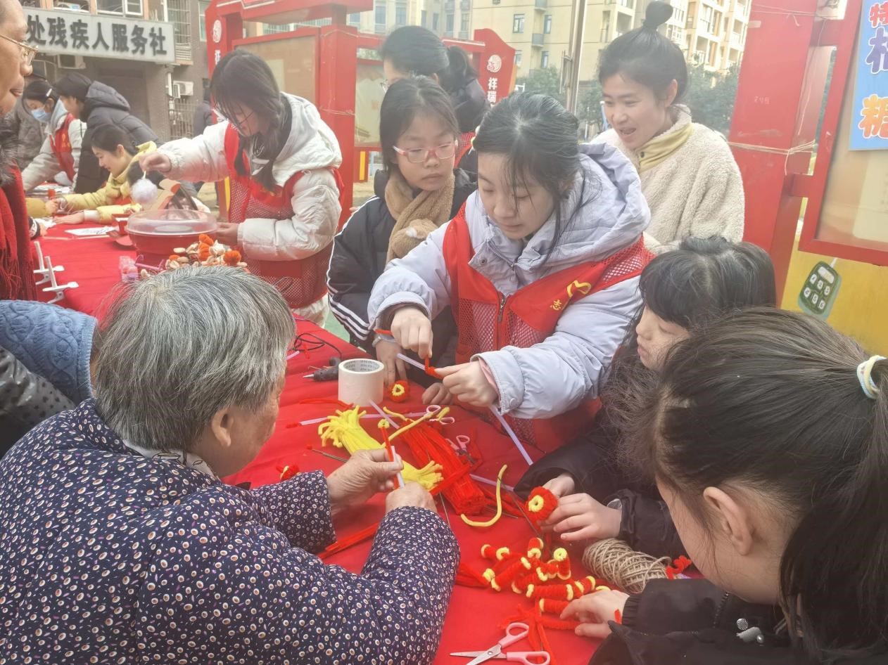手作互动区则洋溢着温馨的创作氛围。在志愿者的指导下,家长与孩子们围坐在一起,用扭扭棒制作新年主题手工艺品。扭、绕、折、固定……简单的材料在协作下,逐渐变成小巧的红灯笼、喜庆的鞭炮挂件。
