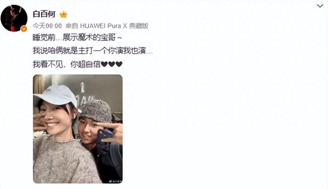 1月29日凌晨,演员白百何在社交平台发布与大儿子合照:“睡觉前…展示魔术的宝哥~我说咱俩就是主打一个你演我也演…我看不见,你超自信 ”