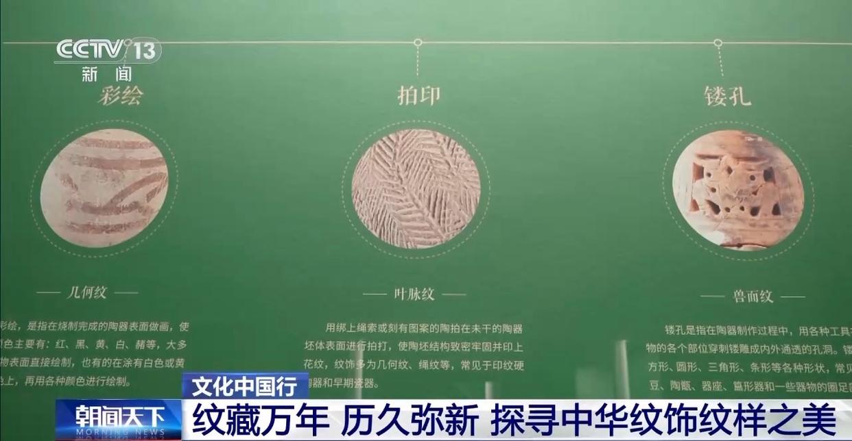 总台央视记者 任梅梅:现在我们看到的就是一件印有树叶脉络装饰的陶罐,在它旁边还有一件用来制作这种叶脉纹的工具,叫作“陶拍”,这些器物说明在几千年前,中国古代的先民们就已经开始用特制的工具来进行纹饰纹样的创作了。