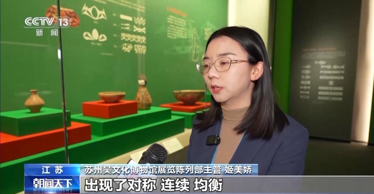 苏州吴文化博物馆展览陈列部主管姬美娇:新石器时代构图法则上出现了对称、连续、均衡,对色彩的运用搭配也有了一定讲究,从技法上、构图法则上面都影响了后代纹饰纹样整体的发展脉络。