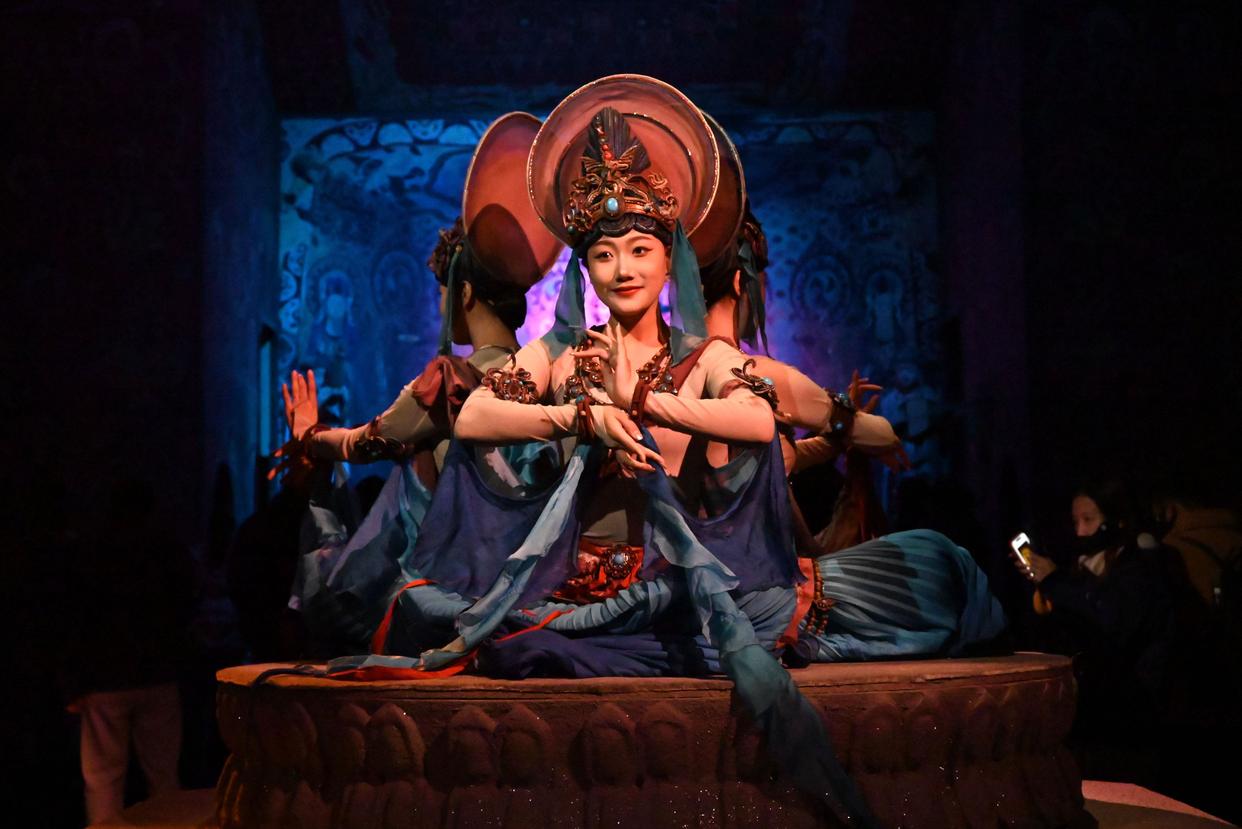 1月9日晚,乐动敦煌(敦煌)文化旅游产业发展有限公司的演员在大型洞窟沉浸式体验剧《乐动敦煌》中表演。新华社发(张晓亮 摄)
