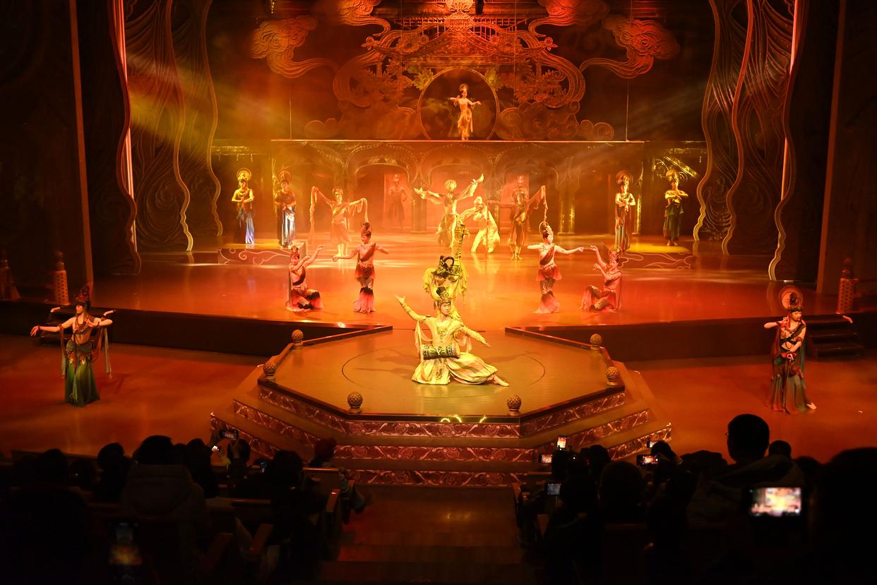 1月9日晚,游客观看大型洞窟沉浸式体验剧《乐动敦煌》。新华社发(张晓亮 摄)