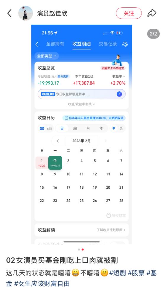 2月2日,赵佳欣再度更新动态,晒出的收益页面显示亏损19993.17元。她坦言:“前天还在沾沾自喜,昨天就回调了”,更直言“买基金刚吃上口肉就被割,这几天的状态就是嘻嘻不嘻嘻”。