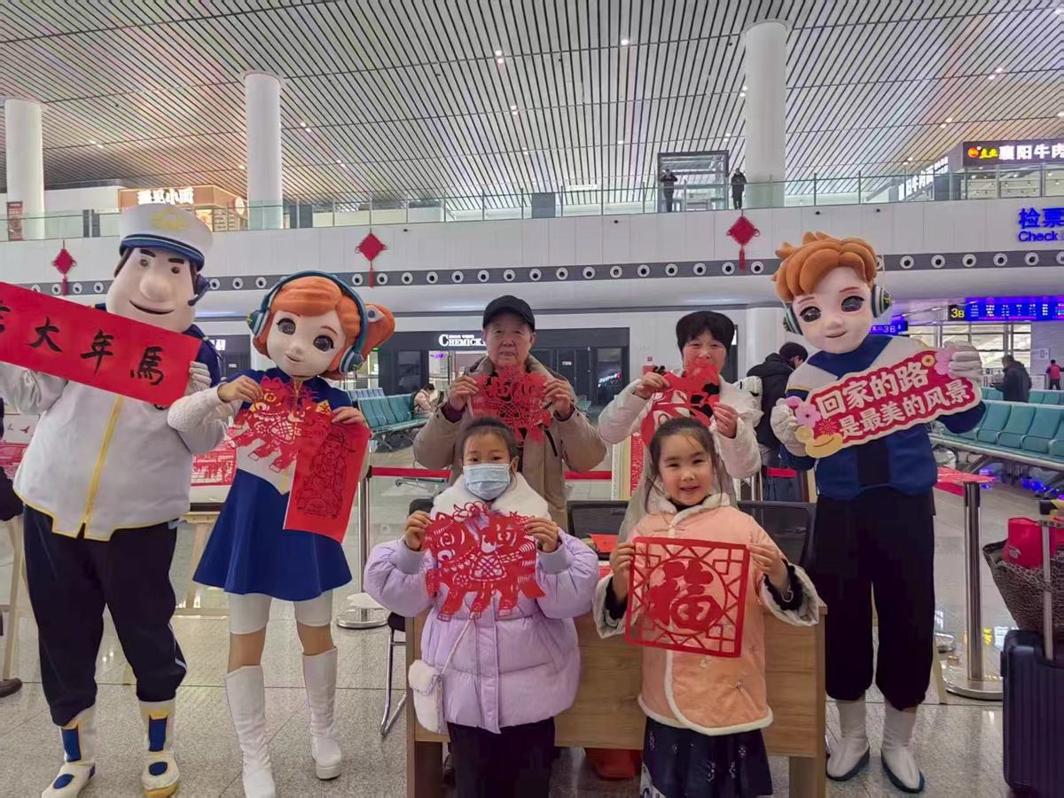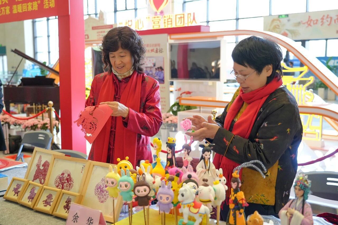 百年老站汉口火车站的文化年味体现在翰墨书香与非遗技艺中。站内一抹独特的文化气息悄然弥漫,数十张桌子井然有序地排列着,李成荣、周大春、唐汝元、张德春、陈永明、殷进、侯庆华、罗昭莲、李欣等书法家们一边和来往旅客交流一边在纸上挥毫泼墨,或楷书工整,或行书流畅,或草书奔放,将一副副寓意吉祥、寄托祝福的春联呈现在众人面前。一问一答、一笔一画间流露出对新春的美好祝愿,也为旅客们回家的路途增添了一份熟悉与亲切。非遗展台上,剪纸、面塑等非遗项目吸引了大量旅客尤其是孩子们的目光,非遗传承人余华、张露文与旅客亲切互动,让候车时光成为生动的文化体验课。火车站内,原本归途的寂寞与疲劳在欢声笑语中被驱散,旅客们纷纷驻足围观并踊跃参与,有的用手机记录下这温馨的一幕,有的兴奋地挑选着自己心仪的春联,有的迫不及待地与家人一同欣赏这份新春的特别礼物,有的则小心翼翼地将春联折叠好,准备带回家中……