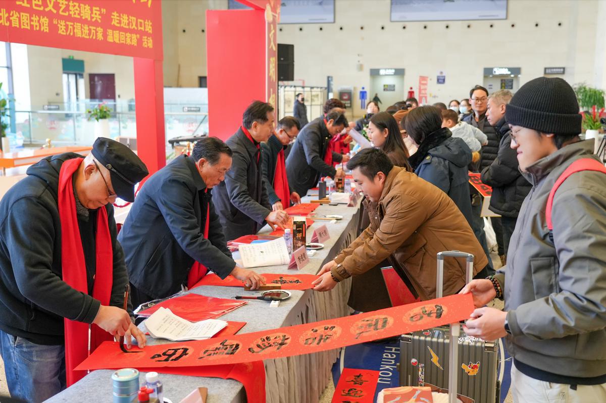 同一时间,武汉站东进站口活动现场,魏启荣、黄文平、张传斌、毛羽、陈利平、胡常青、陈继武、鲁战平、扬秀杰、刘伟、郭海生等书法家们挥毫泼墨,将一副副寓意吉祥的春联和福字赠予旅客,桌前墨香四溢,排队的旅客络绎不绝。两名民间文艺家的展台也是大受欢迎,国家级非遗云梦皮影戏市级传承人陈红军表演了一场精彩绝伦的皮影戏,国家级非物质文化遗产仙桃雕花剪纸代表性传承人严洁带着她的作品向旅客们讲解着其中的奥秘。