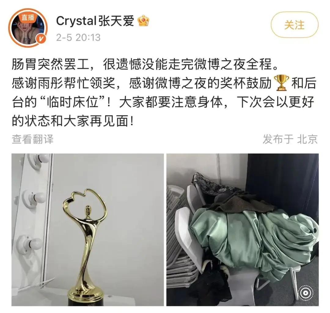 感谢雨彤帮忙领奖,感谢微博之夜的奖杯鼓励和后台的“临时床位”!大家都要注意身体,下次会以更好的状态和大家再见面!