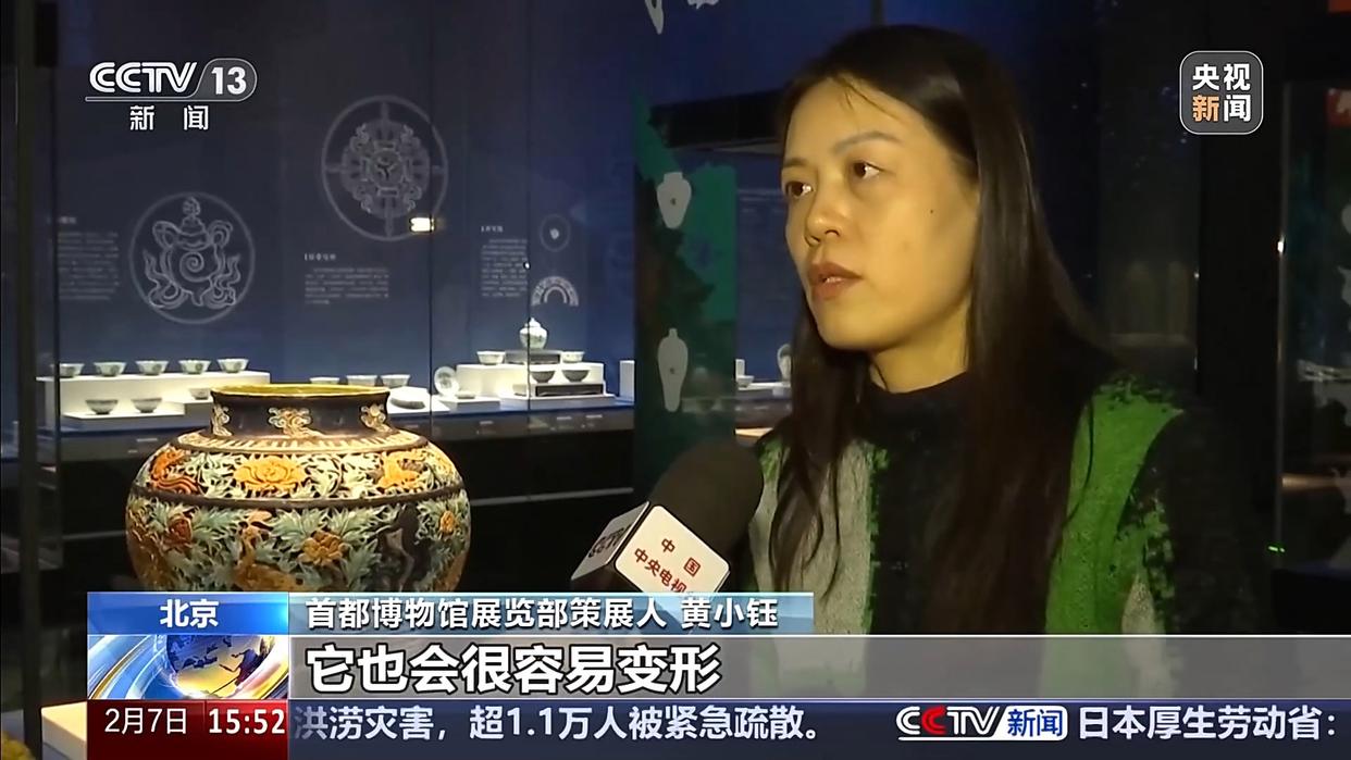 首都博物馆展览部策展人黄小钰:这件珐华器工艺非常复杂,器型也很大,同时还有双层镂空。从器型、颜色、镂空工艺来看,这件文物保存得很好、十分精美。