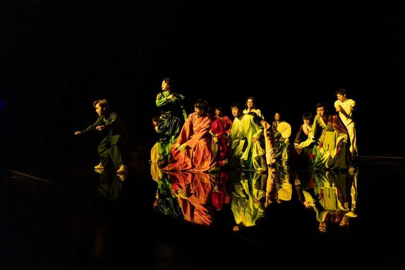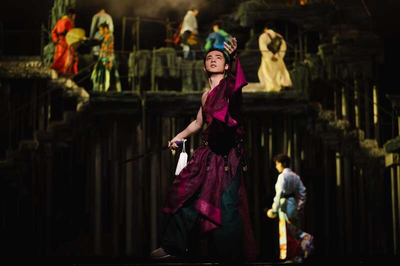 舞台上的巨型装置模块,携水乡建筑的灵秀缓缓铺展,银色小船载着角色泛波而来。光点随旋律纵横游走,竖为经,承托千年文脉,横为纬,交织古今时空,既致敬江南丝绸的精湛工艺,又让历史名士与当代行者在经纬交错中完成跨越时空的对话。