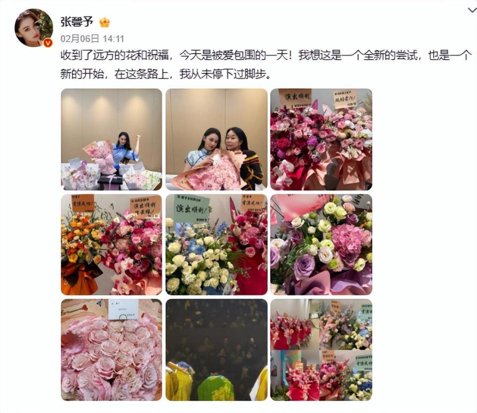 2月5日,张馨予舞台剧《江南十二场欢聚》在江苏首演,她在社交平台发文晒图:收到了远方的花和祝福,今天是被爱包围的一天!我想这是一个全新的尝试,也是一个新的开始,在这条路上,我从未停下过脚步。