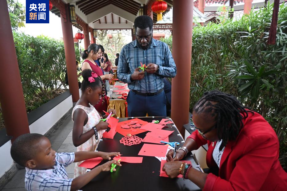 △出席招待会的嘉宾体验中国传统剪纸