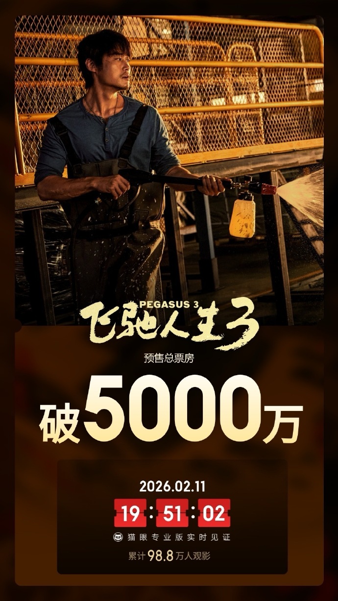 2月11日,据猫眼专业版数据,电影《飞驰人生3》映前6天,预售总票房破5000万。