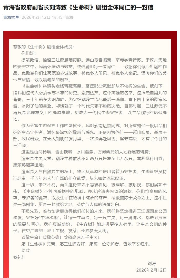 据青海省林业和草原局官方公众号消息,2月12日,青海省副省长刘涛给《生命树》剧组写了一封信,内容如下: