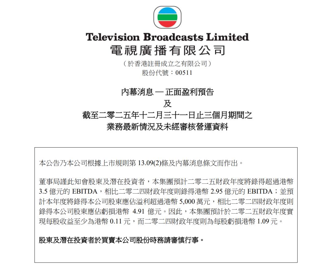 近日,电视广播有限公司(简称:电视广播;英文简称:TVB;000511.HK)发布业绩盈利预告,预计2025财年盈利超过5000万港元,同比扭亏为盈,2024年财年公司亏损4.91亿港元。公司预计2025财年EBITDA(息税折旧及摊销前利润)超3.5亿港元,2024财年为2.95亿港元;实现每股收益至少0.11港元,2024年财年每股亏损1.09港元。