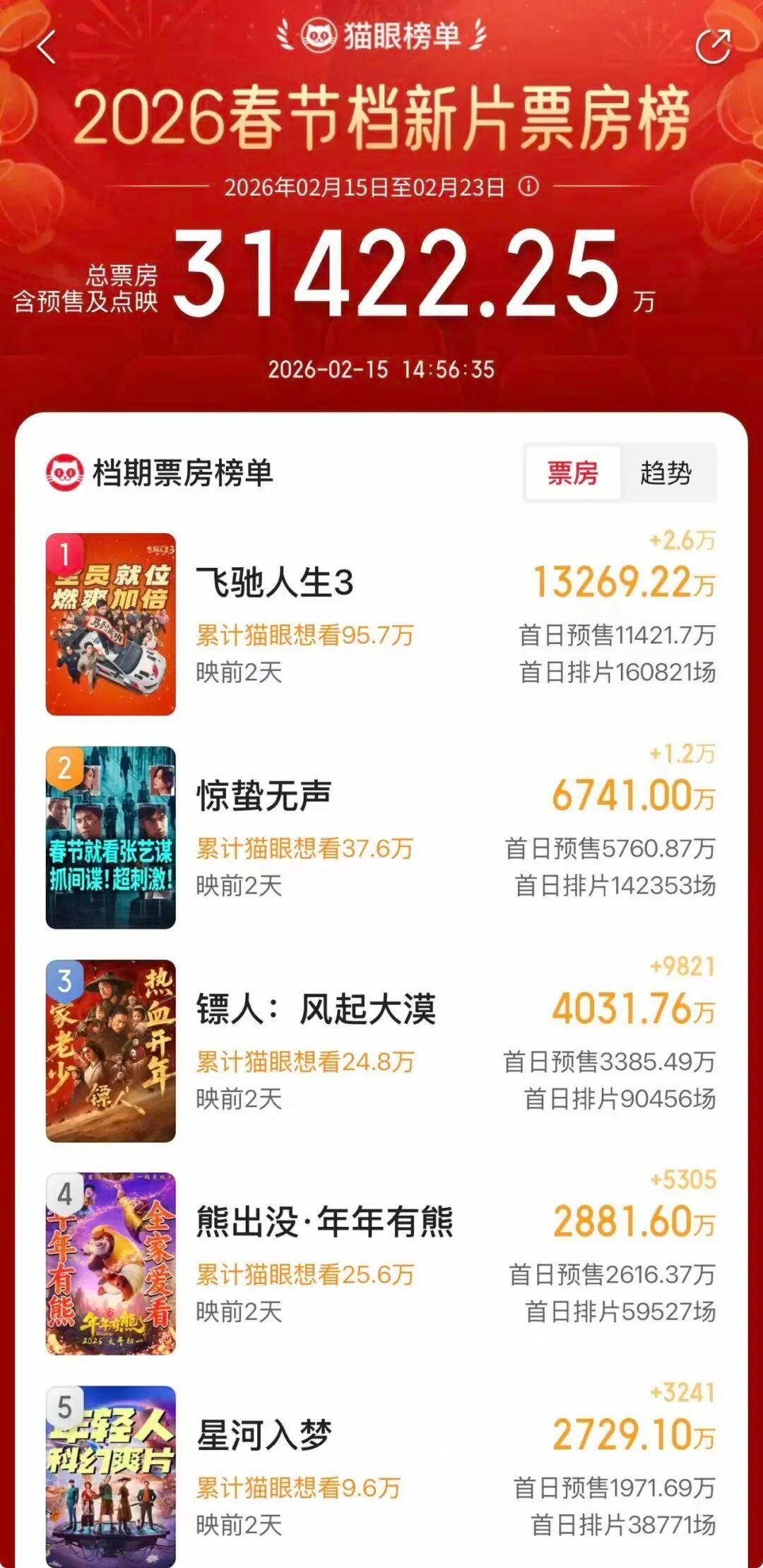 截至发稿,2026年春节档总票房已突破3亿元。其中《飞驰人生3》独占鳌头,大幅领先第二名《惊蛰无声》,《镖人》《熊出没》《星河入梦》位列3—5名。