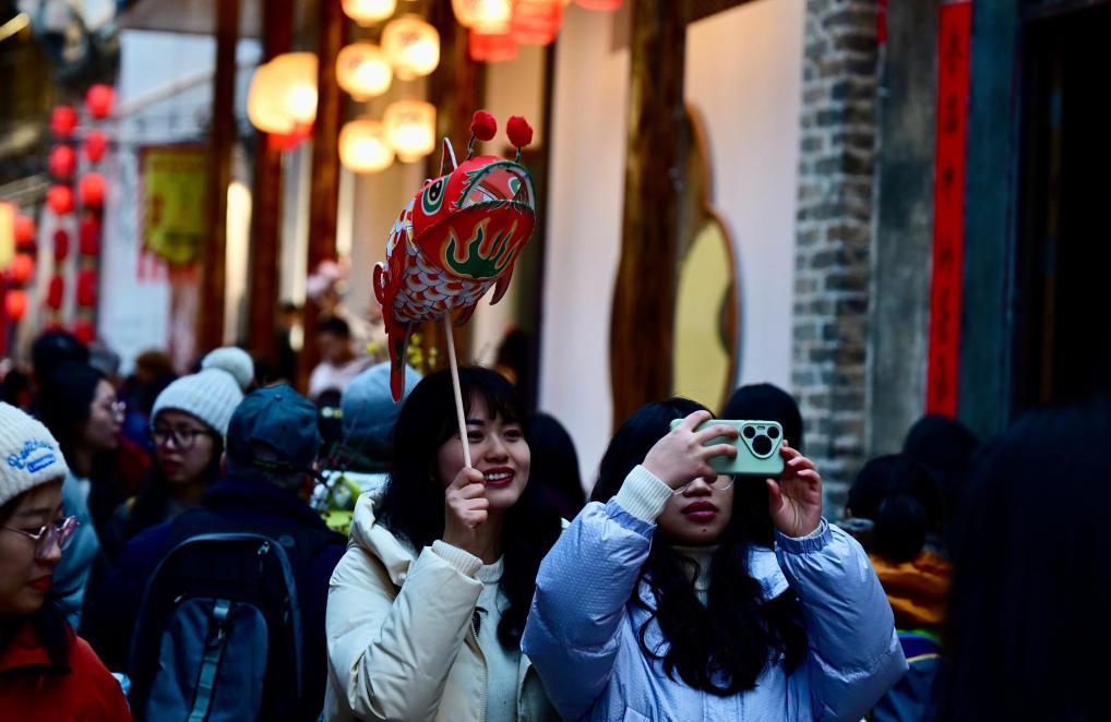 2月7日,游客在瞻淇村里体验鱼灯表演。