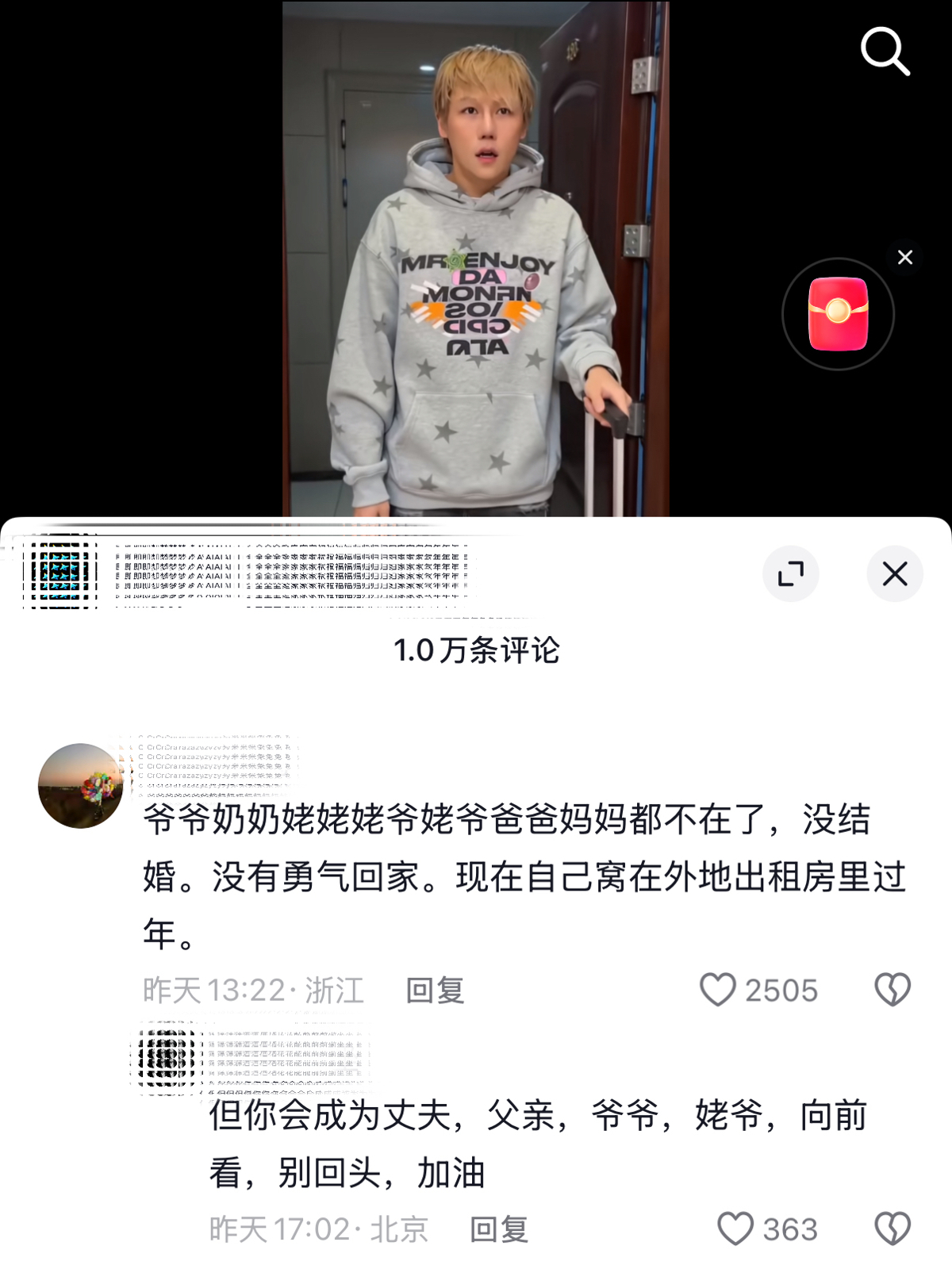 不少跟刘维有着同样痛苦的网友,在评论区留言写下了自己的孤单。有网友说,家人都不在了,过节变成了最难受的事,还有网友说,爷爷奶奶姥姥姥爷爸爸妈妈都不在了,“没结婚,没有勇气回家,现在窝在外地出租房里过年。”