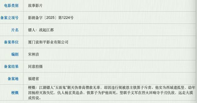 记者在国家电影局官网搜索发现,早在去年7月,同样由“厦门袁和平影业”出品的《镖人:战起江都》就已经备案公示。该片故事梗概为:江湖镖人“玉面鬼”剿灭伪善高僧救无辜,却因违行规被恩主铁算子斥责。他实为西域遗孤“竖”,幼年因杨府灭族失忆,被仇人杨玄英追杀,铁算子为护他而死。“竖”联手义军在烈火回响寺手刃仇敌,远走大漠成传说。