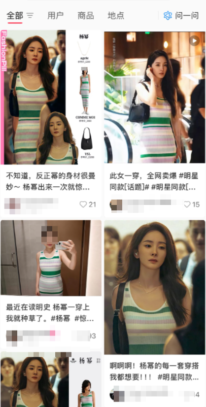 记者注意到,杨幂因在电影《惊蛰无声》中饰演“白帆”一角,带火白绿条纹吊带裙的穿搭,引全网热议。不少网友在社交平台分享自己穿杨幂同款的照片,甚至有部分商家在平台推出杨幂同款吊带裙平替款,不少网友在评论区求购。