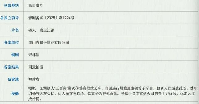 新闻记者在国家电影局官网搜索发现,早在去年7月,同样由“厦门袁和平影业”出品的《镖人:战起江都》就已经备案公示。