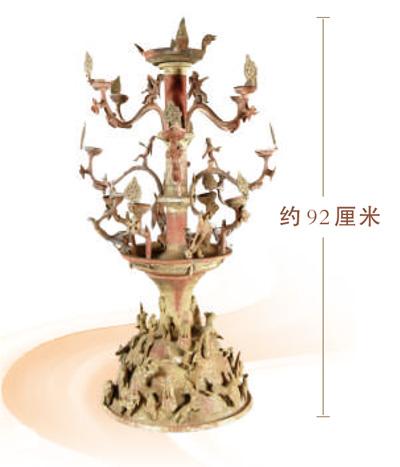 细看此灯:最上部灯盏以朱雀赋形,雀首引颈高昂,双翼赳立,尾羽束敛,将灯盏缀饰为四瓣花状;中间的灯柱呈竹节状,象征古代神话中的通天神柱,分3层插接12支曲枝灯盏,每层4枝从灯柱中虬奇生出,错落有致。曲枝近柱处各端坐一位羽人,背生双翼,神情肃然。灯柱下端塑一圆盘,与上端顶盘呼应,4条龙首自盘中蜿蜒伸展;最下部灯座呈覆钵形,钵的表面为3层嵯峨递缩的雄伟山峦,象征着古人信仰的昆仑仙山。