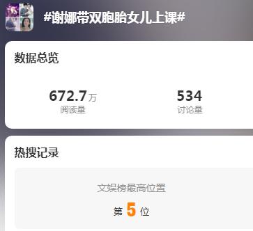 2月25日,有博主发布了主持人谢娜带着两位女儿去上课的多个画面,词条“谢娜带双胞胎女儿上课”登上热搜榜。