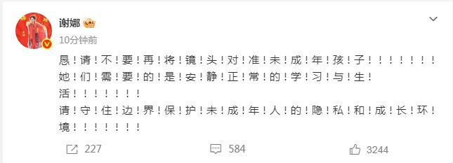 随后,谢娜在个人社交账号发文呼吁大家不要将镜头对准未成年孩子,文中共有68个感叹号,看得出她情绪十分激动。谢娜写道:“恳请不要再将镜头对准未成年孩子!她们需要的是安静正常的学习与生活!请守住边界,保护未成年人的隐私和成长环境!”