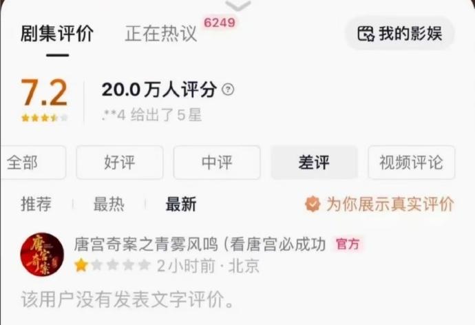 2月24日,有网友发现由白鹿、王星越等主演的电视剧《唐宫奇案之青雾风鸣》的官方抖音账号,在抖音平台为该剧打出了一星差评,此举引发网友热议。