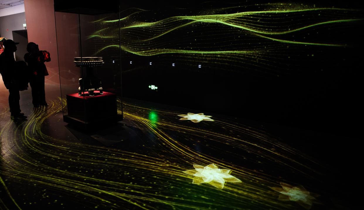 2月27日,参观者在“既往未来——小西天文物撷珍与悬塑艺术特展”的“无量之境”展台参观。新华社记者 殷刚 摄