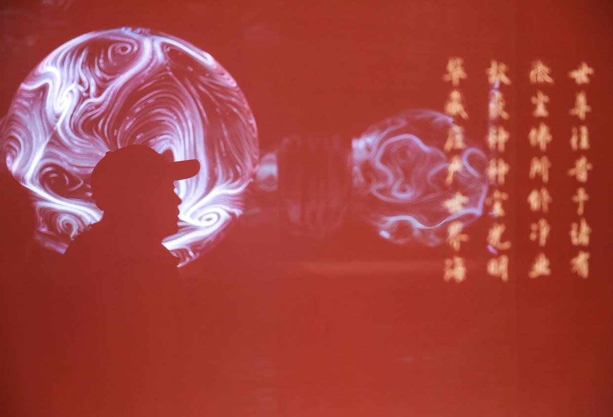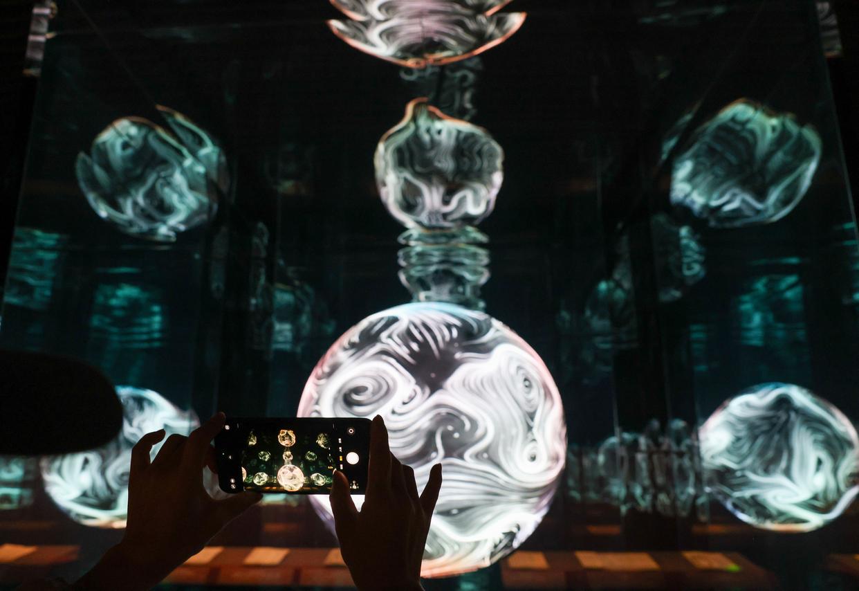 2月27日,参观者在“既往未来——小西天文物撷珍与悬塑艺术特展”的“无量之境”展台拍摄。新华社记者 殷刚 摄