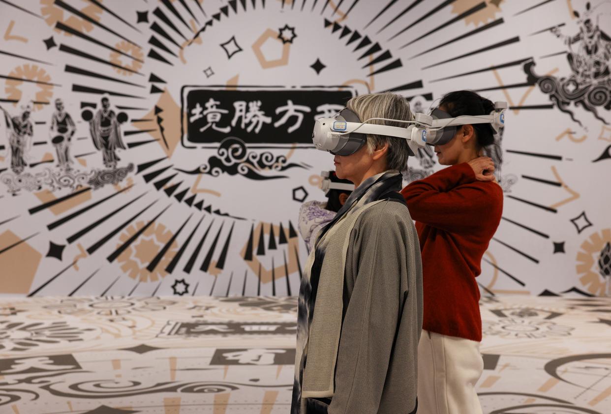 2月27日,参观者在“既往未来——小西天文物撷珍与悬塑艺术特展”体验VR实景参观。新华社记者 殷刚 摄