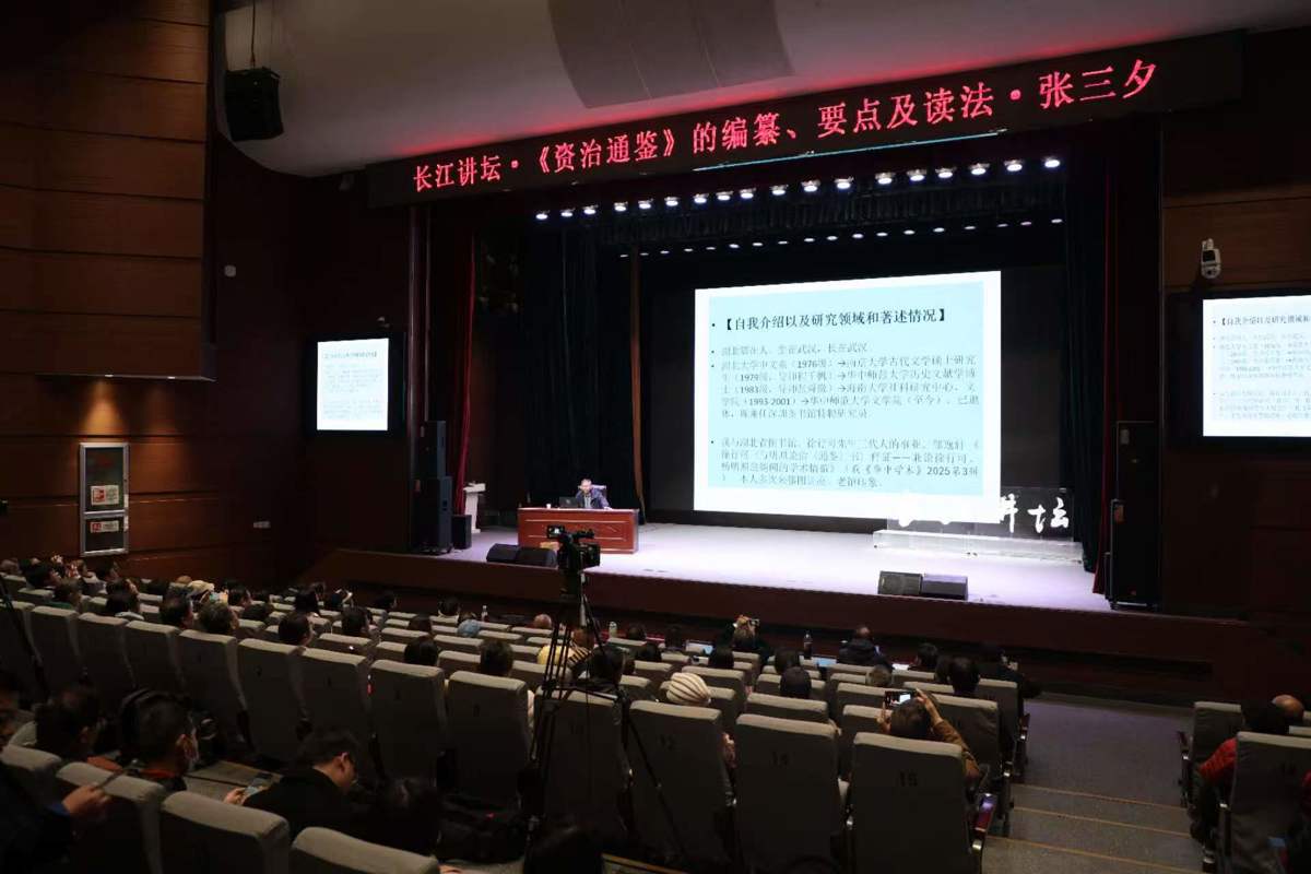 讲座尾声,张三夕教授以钱钟书先生“遍读中外大经大典,此生无憾”的典故勉励读者:“若此生只读一部中国典籍,《资治通鉴》当为首选。”(本文图片由长江讲坛提供,摄影:王亮)