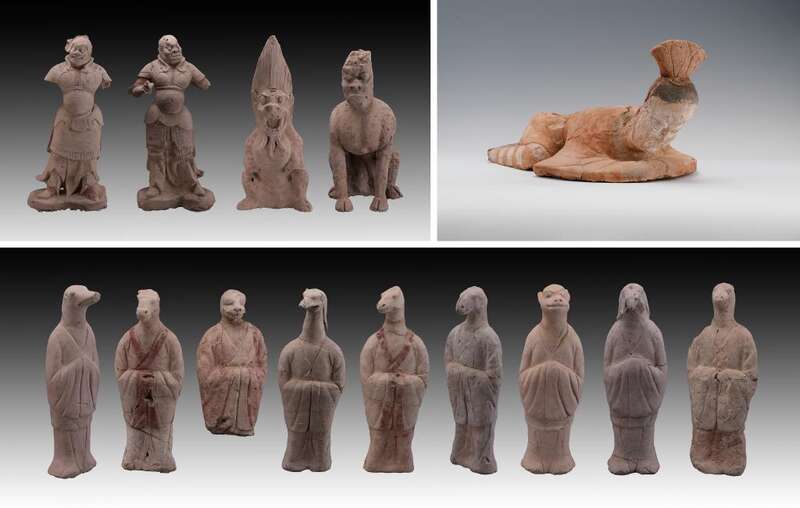 拼版照片:新疆吐鲁番市巴达木东晋唐时期墓群出土的陶俑(资料照片)。新华社发